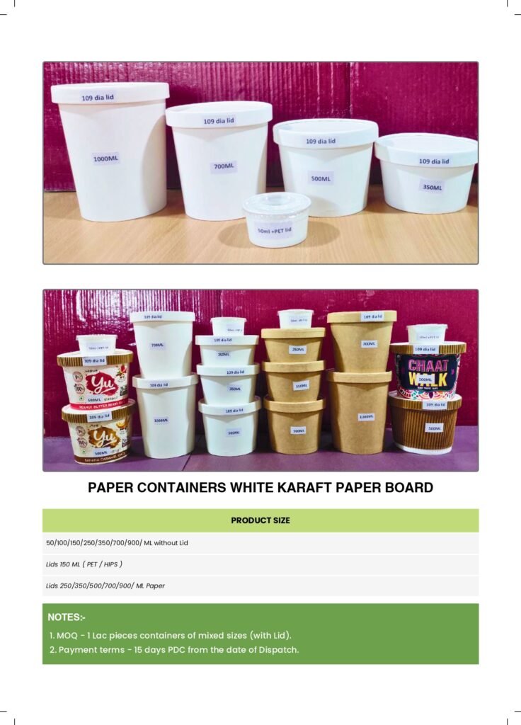 Eco-friendly and safe for earth sustainable and compostable packaging is available for in-house serving and take-away eating joints. We offer safe, hygienic, sturdy, leak-proof, non-interfering and convenient containers for food and beverages. Paper cups of different sizes and textures, sectioned trays, bowls, forks and spoons are on offer for hotels, restaurants and home delivery outlets. All the containers, cups and trays are available with or without lids.